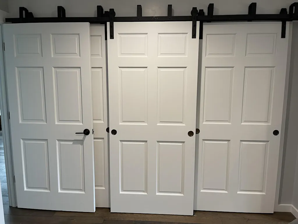 Ty used the Classic Strap Bypass Barn Door Hardware Kit in the 4-door configuration to close off his laundry room, using barn doors that he built himself and the BarnCraft Vista Flush Pull Handles.